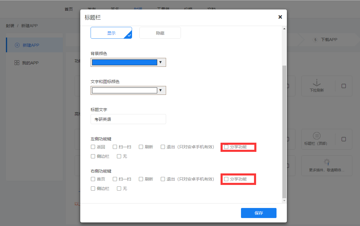 3. 去【顶部标题栏】进行选择分享按钮出现的位置。点击保存,重新封装APP即可。